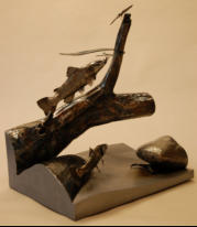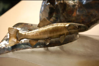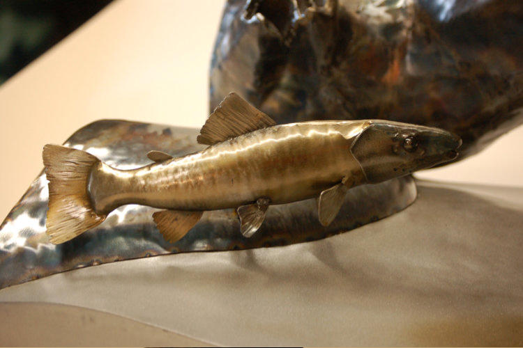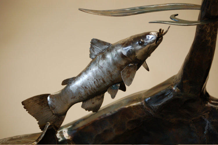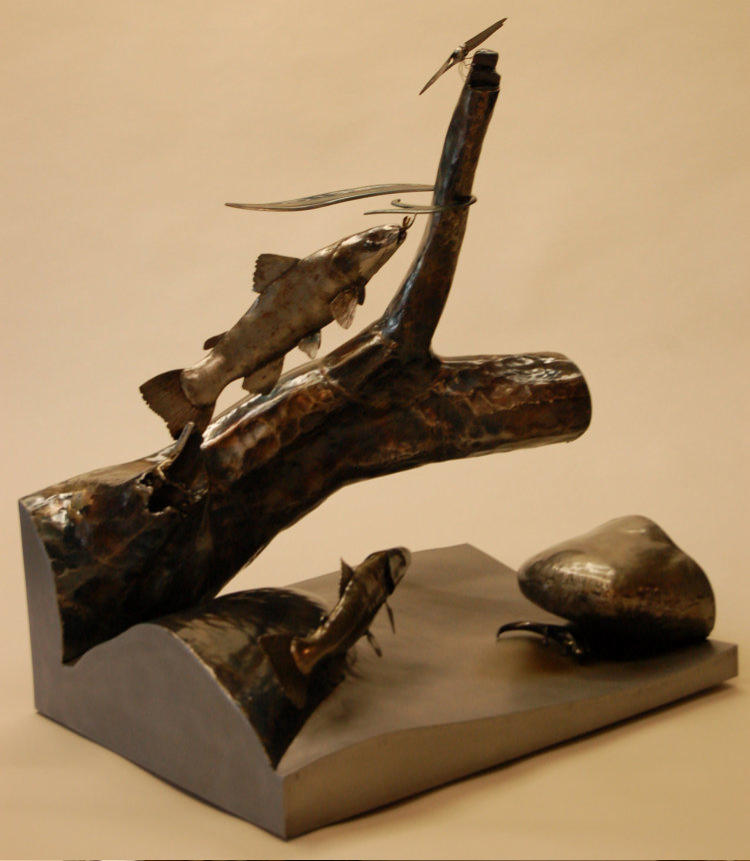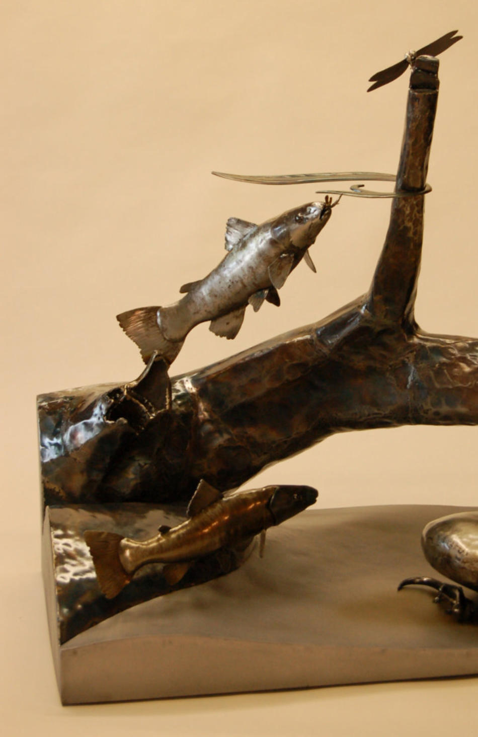 This is one of my favorites. The piece is 24”h x 20”w x 16”d. Made completely of hammered steel, River Life has a lotgoing on. It portrays a moment frozen in time in a river environment.